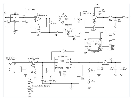 該電路由兩節AAA電池供電。使用二極管提供反向電壓保護會浪費寶貴的電能,因此本電路使用P溝道MOSFET (Q2)。該MOSFET通過阻塞反向電壓來保護電路,施加正電壓時導通。MOSFET的導通電阻小于100 mΩ,因此它引起的壓降遠小于二極管。除AAA電池以外,降壓-升壓調節器ADP2503還允許使用最高5.5 V的外部電源。在省電模式下工作時,ADP2503的功耗僅38 μA.由L2、C12和C13構成的濾波器可消除模擬電源軌產生的任何開關噪聲。連接外部電源時,該儀表不是通過一個電路來斷開電池,而是利用一個插孔以機械方式斷開電池,從而避免電能浪費。