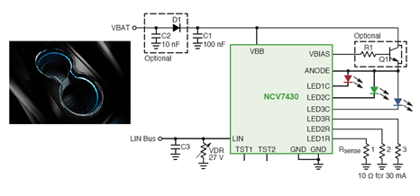 安森美半導(dǎo)體的NCV7430 LIN RGB LED驅(qū)動(dòng)器結(jié)合了LIN收發(fā)器與RGB LED驅(qū)動(dòng)器和內(nèi)存。它是一個(gè)單芯片RGB驅(qū)動(dòng)器,旨在監(jiān)測(cè)汽車(chē)內(nèi)部照明中的專(zhuān)用多色LED應(yīng)用。它包含LED顏色和亮度參數(shù)編程的LIN接口(從設(shè)備)。器件通過(guò)LIN總線接收指令,隨后獨(dú)立驅(qū)動(dòng)LED。
