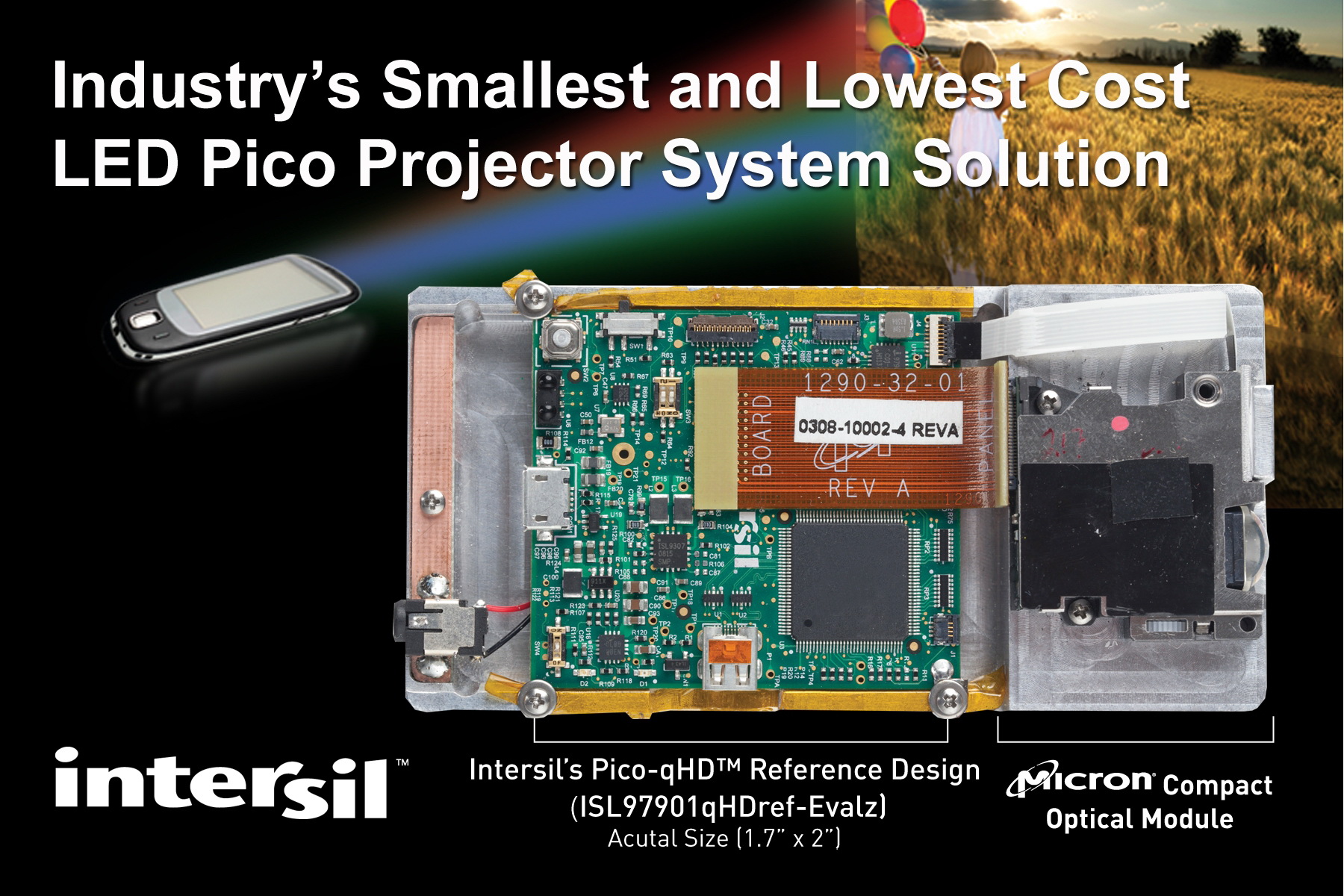 Intersil Pico-qHD™ 為低功耗和成本敏感型嵌入式或配套微型投影儀應用而開發(fā),提供了完全集成的參考設計,其中包括高量生產(chǎn)的光引擎、硬件、固件和可定制設計文件。該低成本的系統(tǒng)解決方案,采用美光(Micron)公司的 E330 緊湊型 5.5 立方厘米 qHD 光引擎,可以輕松集成到廣泛的應用,包括美光最近推出的便攜式PoP Video™微型投影儀移動設備配件。Pico-qHD™ 建立在緊湊、便宜的 1.7×2 英寸印刷電路板,可滿足如消費類等應用的低制造成本要求,如數(shù)碼相機、移動電話、平板電腦、視頻播放器和其他手持產(chǎn)品。受這些應用的推動,太平洋媒體協(xié)會(Pacific Media Associates)預測微型投影儀的年銷售量將在2015年達到5800萬件。