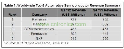 瑞薩電子的汽車半導(dǎo)體營業(yè)收入為7.27億美元,遙遙領(lǐng)先于其它競爭對手。排在其后的廠商是德國英飛凌、法國-意大利企業(yè)意法半導(dǎo)體、美國飛思卡爾半導(dǎo)體和荷蘭恩智浦半導(dǎo)體,如表1所示。