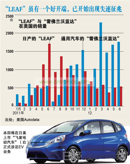 下圖為美國(guó)調(diào)查公司Autodata統(tǒng)計(jì)的、LEAF在美國(guó)市場(chǎng)的銷(xiāo)量走勢(shì)。該車(chē)于2010年12月上市,2011年銷(xiāo)勢(shì)良好,但進(jìn)入2012年之后銷(xiāo)售速度減慢,截止6月份已連續(xù)三個(gè)月低于上年同月。與競(jìng)爭(zhēng)車(chē)型——美國(guó)通用汽車(chē)(GM)的“雪佛蘭·沃藍(lán)達(dá)”在銷(xiāo)量上發(fā)生了逆轉(zhuǎn)。