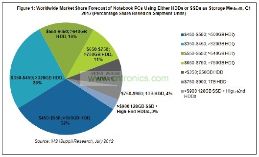 在所有以HDD或SSD為主要存儲介質的筆記本電腦中,采用500GB以上硬盤、價格為450至550美元的筆記本第一季度占有最大的市場份額,為32%。采用320GB以上硬盤、價格為350至450美元的筆記本份額為26%,排名第二。128GB SSD筆記本或非常高端的硬盤筆記本只占3%的份額,二者的價格均高于900美元,如圖所示。
