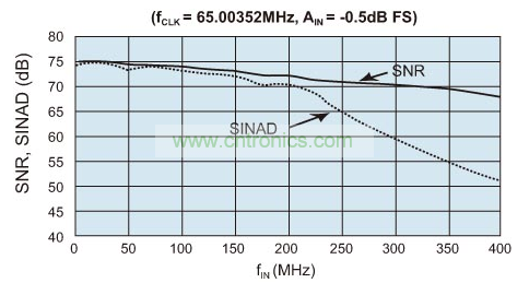 圖1:MAX12559在96MHz時鐘頻率、-1dBFS輸入時,SNR和SINAD與輸入頻率的對應關系曲線。