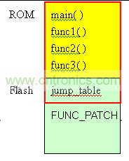 在上圖中,黃色區域是IC的ROM,這部份的程序是IC制作出來即不可以改變。綠色部份是flash。在圖中,flash分成2區,一個是jump_table,存放func1~func3的地址。剩余的空間FUNC_PATCH,預留給patch使用。