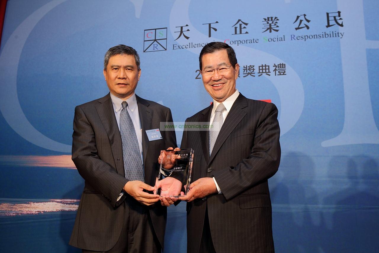 臺達電子海英俊董事長(左)出席2012 天下雜誌企業公民獎頒獎典禮, 自 蕭萬長前副總統手中接過大型企業 首獎