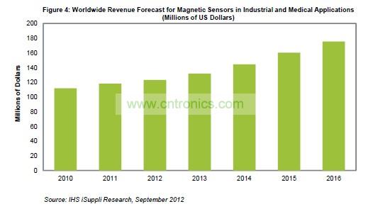 2011年工業(yè)與醫(yī)療磁性傳感器營業(yè)收入為1.182億美元,而2010年是1.119億美元。盡管該領域的營業(yè)收入少于汽車和無線-消費等其它磁性傳感器領域,但將促進未來幾年傳感器市場持續(xù)擴張。到2016年,這個磁性傳感器領域的營業(yè)收入將增至1.755億美元,如圖所示,五年復合年度增長率為8%。