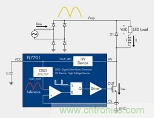 FL7701集成有功率因數校正(PFC)。可以從使用小型陶瓷維持電容的整流離線輸入來供電。這樣就可省去輸入端的電解電容,也不需要用于IC的自偏置電源軌。