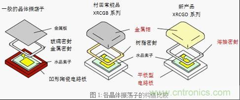 一般的晶體振蕩子采用的是凹形陶瓷電路板,本公司采用的是跟CERALOCK®相同的平板型電路板。因此提高了包裝內部的空間利用率,與一般的晶體振蕩子相比能搭載更大的晶體元素。此外,由于金屬帽和電路板連接,常規產品采用的是樹脂封裝,XRCGD系列采用的是熔接封裝,通過密封構造對應了頻率的高精度化。(圖1)