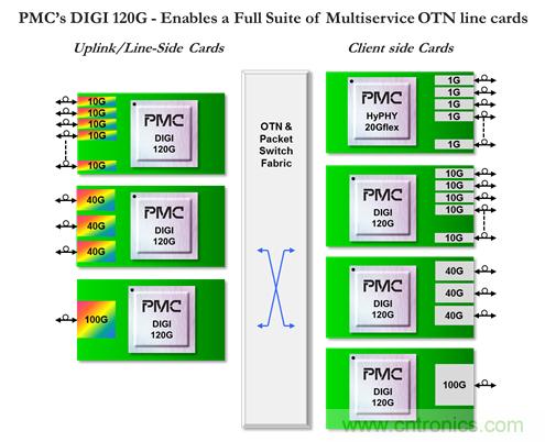 云服務(wù)和LTE帶來數(shù)據(jù)流量的持續(xù)增長(zhǎng),從而催生了大數(shù)據(jù)傳送的需求。電信運(yùn)營(yíng)商在規(guī)劃下一階段的光傳送網(wǎng)絡(luò)時(shí),將會(huì)繼續(xù)依賴OTN交換來提供云服務(wù)所不可或缺的擴(kuò)展性、網(wǎng)絡(luò)彈性、全方位的OAM以及業(yè)務(wù)的高速傳輸。為了讓運(yùn)營(yíng)商能夠進(jìn)行高效的擴(kuò)展和升級(jí)來滿足數(shù)據(jù)及網(wǎng)絡(luò)的需求,設(shè)備商必須提供創(chuàng)新性的解決方案以幫助運(yùn)營(yíng)商高效地利用其光網(wǎng)絡(luò)帶寬資源。而PMC的Digi 120 OTN處理器則幫助設(shè)備商在其提供給運(yùn)營(yíng)商的光傳輸設(shè)備里滿足所有下一代光傳送網(wǎng)所需要的功能。