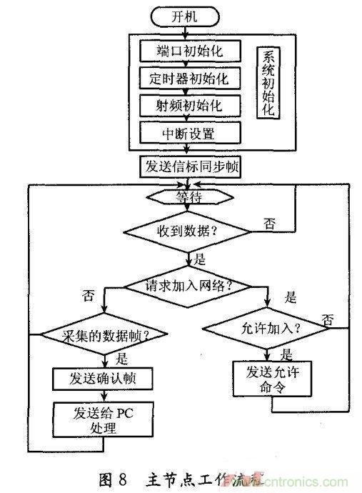 傳 感節點軟件和傳感器協調器軟件的程序流程分別如圖7和圖8所示。本流程在IEEE802.15.4協議基礎上,結合TDMA技術和無線傳感器網絡S- MAC協議思想而設計。從圖7可以看出,為了節省傳感節點的能耗,除加人網絡請求、發送數據和偵聽同步信標幀時段外,傳感節點均處于休眠狀態。