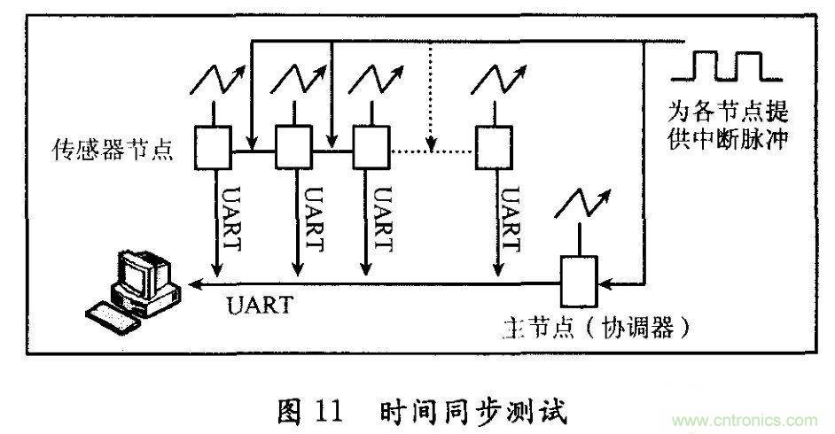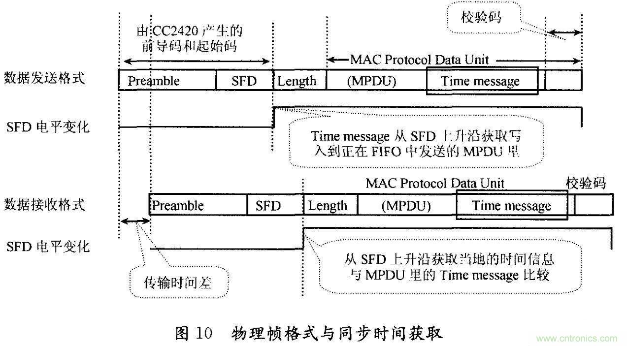 時間同步協議軟件的測試連接圖如圖11所示。主控節點和傳感器節點被連接到一 個公共的有線信號上,這個信號又連接到MSP430的帶計時器捕獲周期性地發送一個包含時間信息的信標幀給從節點來維持網絡同步通信。在協議軟件實現時, 需要對FTSP進行簡化,采用ZigBee星型網絡拓撲結構對時間同步所需的計算資源進行最小化處理。Zig-Bee消息的時間固定點選擇為幀起始限定符 (SFD)。參考圖3中的CC2420射頻收發器與微控制器接口對應管腳的高低電平,圖1O顯示了IEEE802.15.4物理幀格式l和時間信息獲取過 程。主節點無線收發器發送一個信號給控制器,指示SFD字節已被接收或發送。一旦SFD字節被發送,無線收發器驅動SFD管腳,向微處理器提出中斷要求, 并啟動時間捕獲。這樣,微處理器在SFD字節被發送后可立即獲得一個時間點,并將該時間插入到當前的時間同步消息中去。同樣,當接收器接收到SFD,也隨 即產生一個本地時間信息,并把它和時間同步消息一起存儲。微控制器通過比較兩個時間信息,可以確定本地時間和全網時間的偏移量,并調整本地時鐘與主節點 (協調器)全局時鐘保持一致。