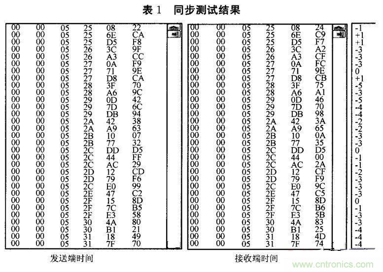 表 1給出了十六進制數據表示的時間同步測試結果。表中,左邊三個兩位十六進制數分別表示小時、分鐘和秒,接著兩個兩位十六進制數表示毫秒,最右邊的兩位十六 進制數以10微秒為單位。從表中可以看出:當同步校正間隔約為1s時,以約100mS的頻度中斷一次進行同步測試,其最大時間同步誤差為50us。顯然, 時間同步精度滿足設計要求。在時間同步測試過程中還發現:提高同步消息發送的頻率,網絡節點時間與全網時間可維持更好的同步。