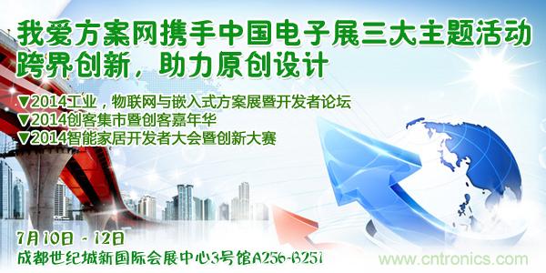 【導(dǎo)讀】我愛方案網(wǎng)和CNT Networks攜手中國電子展主辦的“2014工業(yè)、物聯(lián)網(wǎng)和嵌入式設(shè)計(jì)方案展暨中國西部電子開發(fā)者與創(chuàng)客論壇”即將于2014年7月10日-12日在成都開幕。同期同地,我愛方案網(wǎng)還將舉辦2014創(chuàng)客集市暨創(chuàng)客嘉年華活動,以及與千家網(wǎng)合辦2014智能家居開發(fā)者論壇暨創(chuàng)新大賽(成都)。