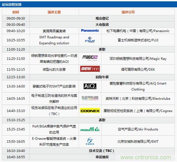 據主辦方介紹,為期一天的論壇將結合嘉賓演講和產品展示兩大形式為到場專業觀眾提供豐富的視聽體驗,更為電子制造設備/系統/方案使用者提供了深入了解供應商“智”造服務的良好機會。在嘉賓演講版塊,主辦方邀請到來自Panasonic(松下)、Fuji(富士機械)、明銳理想、DEK(得可)、英特沃斯、康耐視、空氣產品、東械等涵蓋電子制造全產業鏈各生產環節的領先供應商代表。在現場產品展示方面,與會觀眾更有機會近距離體驗來自Fuji(富士機械)、明銳理想、DEK(得可)、華普通用、英特沃斯、善思光電、章和電氣、首為國際(APOLLO SEIKO)、Praxair(普萊克斯)、東星科技、日本奧泰斯(OPTEX FA)等優質供應商提供的先進技術及設備。