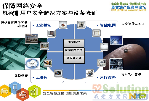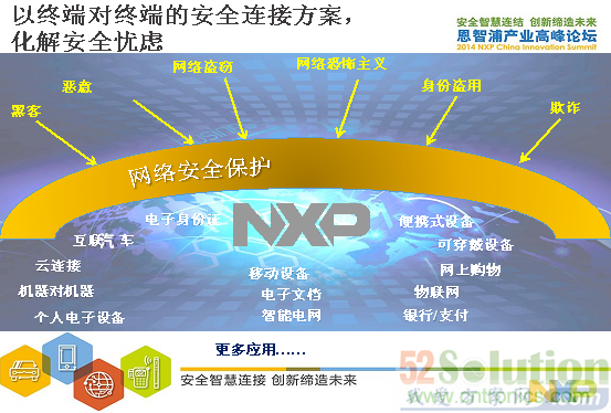 從以上圖中可以看到NXP保障網(wǎng)絡(luò)安全的方案,從工業(yè)控制,智能電網(wǎng),醫(yī)療設(shè)備和云服務(wù)方面。另外,NXP也提供以終端對終端的安全連接方案在互聯(lián)汽車、物聯(lián)網(wǎng)和便攜的可穿戴式應(yīng)用。