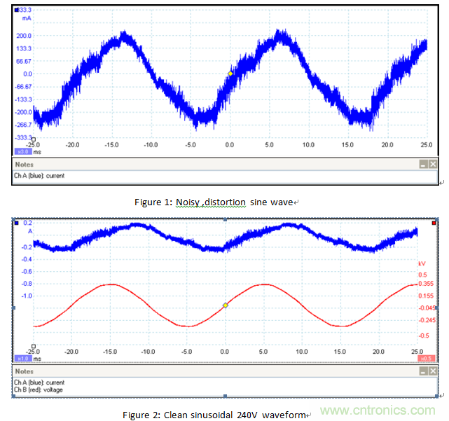 將風扇插入改良過的延長線中,然后再插入電源。打開電流鉗,按“ZERO”按鈕歸零,然后將電流鉗夾在延長線的火線上,電流鉗BNC端連接到示波器的A通道。打開筆記本電腦上的PicoScope 6軟件,設置A通道觸發,選擇A通道定制探頭中的”60A current clamp(20A mode)”選項。之后,打開風扇,我們看到一個PicoScope界面顯示一個有噪聲的失真的正弦波形(Figure 1)。
