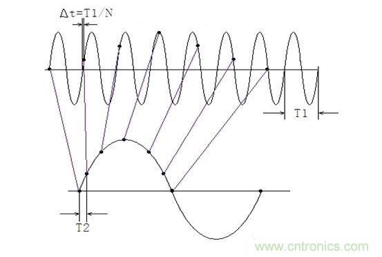 可以看到,等效采樣方法在輸入信號一個周期內(nèi)僅采樣一個點(diǎn)且每個周期采樣的相位有遞增關(guān)系(圖1中△t),調(diào)整這個遞增相位可以達(dá)到調(diào)整相位分辨率的目的。