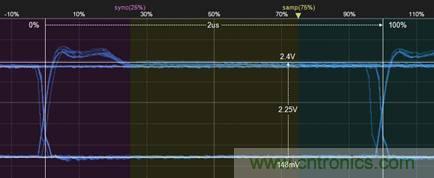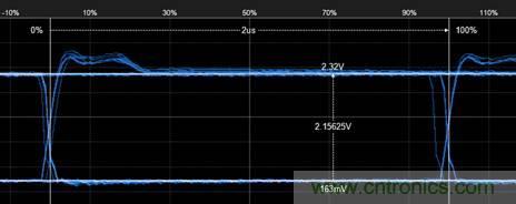 4. 然后再測量bit后半段的最大幅值,如圖5所示,為2.25V。則2.25÷2.15=104%,符合GMW3122信號特征標準。