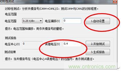 注意:由于GMW3122規定CANH+CANL的電壓要在4.2V~5.8V,而正常為5V。所以在采用對稱性測試時,其中使用的是(CANH+CANL)/2進行判別。 所以標準范圍為2.1V~2.9V,正常為2.5V。因此圖7中誤差電壓需要填入0.4。