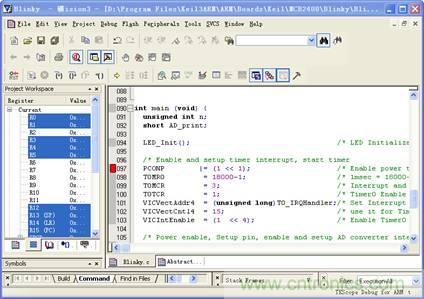 在程序窗口(包括C語言、匯編和反匯編窗口)中, 用鼠標雙擊需要設(shè)置斷點的程序行,則在窗口左邊的狀態(tài)條中出現(xiàn)紅色的斷點標志如圖2所示,完成設(shè)置斷點操作。再次用鼠標雙擊該程序行,窗口左邊的紅色斷點標志消失,則為刪除斷點操作。