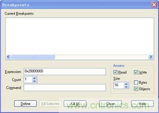 具體定義方法:在Expression內(nèi)輸入變量的地址,然后選擇讀寫屬性,并正確設(shè)置字節(jié)范圍,最后點擊Define即可。例如,在地址0x20004000開始,16字節(jié)范圍內(nèi),定義讀寫斷點操作,具體設(shè)置方法如圖4所示。