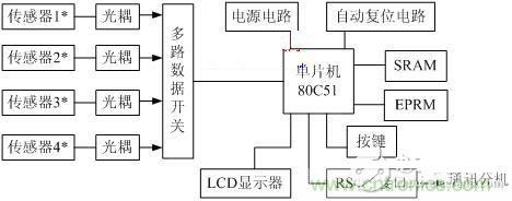 壓力測量控制系統的結構如圖1所示, 它以80C51單片機為核心, 包括傳感器、光耦、多路數據開關、LCD液晶顯示器、SRAM, EPROM、自動復位電路、RS-485接口電路及高效電源電路等。下面分別介紹一下它們各自的設計特點。