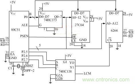 在80C51單片機中,外部I/O口是作為外部RAM來擴展的,選址的方法與擴充外部RAM的方法完全相同。本電路除了外部的RAM外,還有LCD顯示器作為外部I/O器件,因此,只采用線選址方式是不夠的,應采用譯碼選址方式。