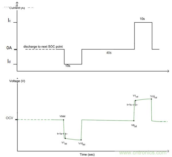 重復第二步和第三步,從而可測得90%至10%SOC共9個點的功率特性。在實際試驗中脈沖電流一般根據被測電池特性決定(一般采用電池廠商提供的最大充放電倍率),SOC目標點可以根據具體需要調整。