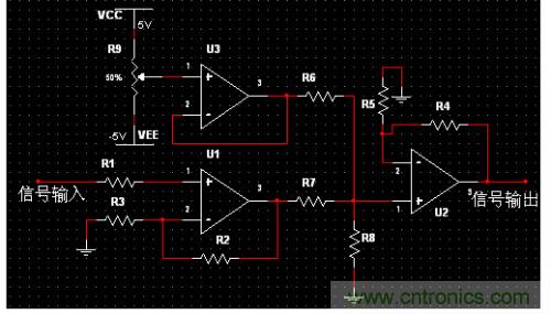 開(kāi)關(guān)CD4051來(lái)連接不同的電阻,不同的R1,R2通過(guò)公式:這樣就可以實(shí)現(xiàn)程控放大功能了。可調(diào)電阻R9用來(lái)設(shè)置信號(hào)調(diào)理電路加入的直流分量的大小。放大后的信號(hào)和直流分量最后由U3模擬加法器疊加后輸出。