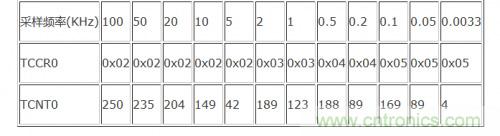 ADC的采樣頻率在上文已有提及,ADC中斷的計(jì)算公式為:,通過(guò)ATmega16的特殊功能寄存器TCCR0的低3位CS02,CS01,CS00的設(shè)置就可以改變的頻率,再把TCNT0設(shè)置成不同的數(shù)值就可以得到這個(gè)系統(tǒng)所需要的各個(gè)采樣頻率值了。表1中的數(shù)據(jù)是通過(guò)上面的公式計(jì)算出來(lái)的數(shù)據(jù)再經(jīng)實(shí)際的系統(tǒng)調(diào)試并修正后的數(shù)據(jù)。