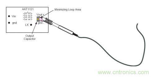 在測量中,如何減小拾取的輻射噪聲?最簡單可靠的方法是采用一個接地環來測量電源紋波以及噪聲。為了進一步的降低測試誤差,可以將示波器探頭和地線直接放在電源輸出電容得兩端。如下圖所示,采用這種方法,在信號探頭和地線之間的環路面積很小,所以測量中帶來誤差的噪聲幾乎可以忽略。
