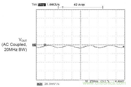 紋波和噪聲指的是在DC/DC轉換器輸入輸出電容上的交流耦合信號,在測試中,一般我們會將這個信號帶寬限制到20MHz。