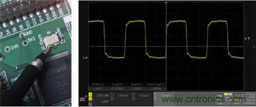 以晶振信號測量為例,如圖1所示為常規的鱷魚線接地測量方法,可看到信號過沖嚴重伴隨振蕩,和想像中的方波不一樣。而圖2所示的短地線彈簧接地測量方法,波形端正不少,顯然資深工程師的方法沒錯。