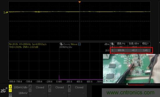 注:通道1信號幅度雖然非常小,但通過FFT分析還是可以定位出600K頻點的干擾。
