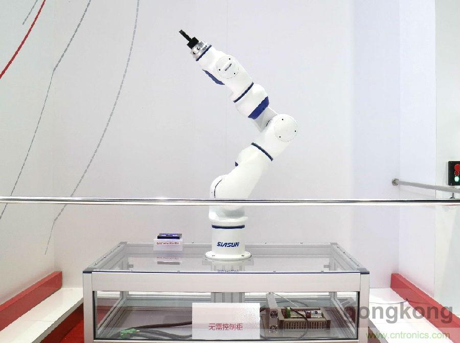 現(xiàn)場(chǎng),內(nèi)置Gold Twitter的新松七軸協(xié)作機(jī)器人華麗亮相,動(dòng)作輕柔簡(jiǎn)潔,控制柜體量小,線纜清晰明了。楊崇武先生介紹,在當(dāng)前的智能制造時(shí)代,設(shè)備越來(lái)越輕量化,埃莫的Gold Twitter系列可以放置在移動(dòng)荷載上、電機(jī)上或電機(jī)內(nèi),從而提高性能、節(jié)省空間,減少電纜和幾乎不需要電氣柜。