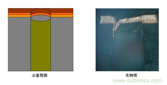 5.圖電孔無銅:斷口處圖電層未將板電層包住―――圖電層與板電層厚度均勻,斷口處齊斷;圖電層呈拉尖趨勢直至消失,板電層超過圖電層繼續延伸一段距離再行斷開。