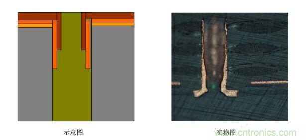 4. 塞孔無銅:圖電蝕刻后,有明顯的物質卡塞在孔中,大部分孔壁被蝕掉,斷口處圖電層未將板電層包住。