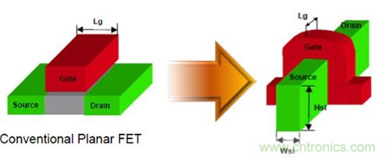 如前面所說,柵極越窄,即納米數(shù)越低,功耗和性能都有明顯收益。但是凡事都有兩面,有收益就會(huì)有代價(jià)。上圖左圖(即前面那張圖的結(jié)構(gòu))中的紅色柵極越窄,則柵極接觸下面的面積就越小。前面說了,綠色源漏(SD)兩極的通斷是靠柵極通電壓控制的,但是面積越小這個(gè)柵極的控制力越弱,這就會(huì)導(dǎo)致出現(xiàn)兩極之間的漏電越來越大。這個(gè)問題在20nm時(shí)達(dá)到了一個(gè)很大的值,對(duì)功耗影響很大。所以早在10年前,就有人提出了右圖中的3D晶體管的新結(jié)構(gòu)。由于這個(gè)結(jié)構(gòu)看上去像張開的魚鰭,所以被叫做FinFET技術(shù)。FinFET技術(shù)最主要的好處是紅色的柵極變成三面環(huán)繞綠色SD兩極之間的通道了,這樣?xùn)艠O就又重新具備了對(duì)這個(gè)通道的強(qiáng)力控制力,原先通過減小柵極寬度的方法就可以繼續(xù)了。有人可能會(huì)有疑問,十年前就提出為什么現(xiàn)在才用,其實(shí)概念到實(shí)施不是那么容易的。大家腦補(bǔ)一下這個(gè)結(jié)構(gòu)是在20nm的范圍里做的,導(dǎo)致工藝要多出十幾二十層來,這不僅是難度,也是成本。