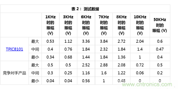圖 2 顯示了表 1 中的結果。 噪聲等級 () 在兩個器件之間大概是相同的,因為遠離中心頻率的振幅基本相同。 在中心頻率,TPIC8101 具有更高的振幅,這意味著其 SNR 要優于競爭產品。