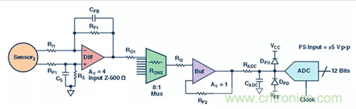 圖2. 差分放大器為數(shù)據(jù)采集信號(hào)鏈的第一級(jí)。