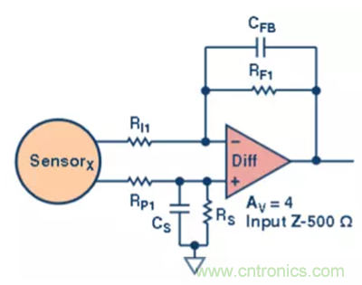 第一級(jí),一個(gè)簡單的差分放大器 (圖2)。該放大器的增益為 4×,輸入阻抗為 500 Ω。設(shè)置電容是為了進(jìn)行可選的濾波處理。