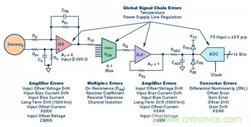 無源和有源器件都會(huì)出現(xiàn)多種誤差。并非所有誤差都很重要,但要記住對(duì)信號(hào)鏈應(yīng)用重要的那些誤差。并非所有誤差對(duì)每種應(yīng)用都有效。在進(jìn)行任何直流精度誤差分析時(shí),決定最重要或者影響最大或權(quán)重最大的誤差有哪些,這是必不可少的步驟。