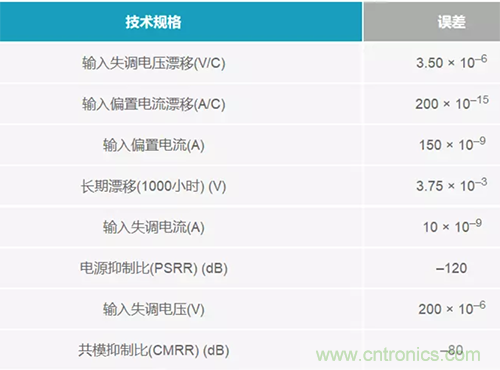 眾所周知,放大器還遠(yuǎn)遠(yuǎn)沒有達(dá)到理想水平。它們有許多誤差,一般都列示于數(shù)據(jù)手冊當(dāng)中。失調(diào)電壓和偏置電流是兩種常見的誤差,但同時(shí)也要考慮任何漂移誤差、長期誤差和隔離誤差(如電源抑制比(PSRR))。表1列出了在使用放大器時(shí)應(yīng)考慮的下列誤差。