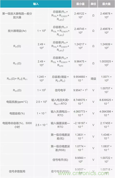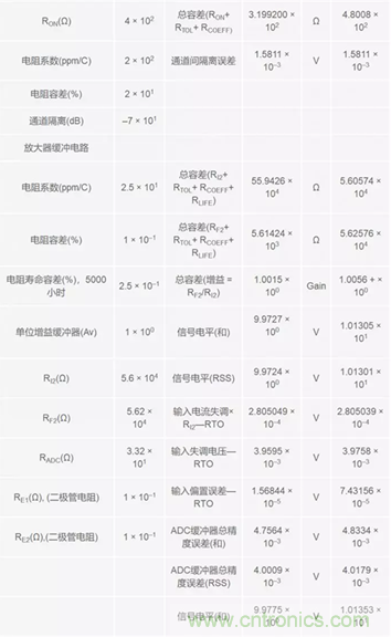 在計(jì)算結(jié)果,所有誤差均已轉(zhuǎn)換成電壓格式。這樣是為了方便起見,因?yàn)檗D(zhuǎn)換器處于信號(hào)鏈末端,其輸入滿量程是以電壓進(jìn)行描述的。RTO (參考輸出)用于描述從一級(jí)到下一級(jí)連續(xù)累計(jì)的 誤差。各級(jí)同時(shí)還產(chǎn)生一個(gè)獨(dú)立的合計(jì)數(shù)和RSS (和方根)合計(jì)數(shù),以展示根據(jù)所用方法的不同,誤差是如何累積起來的。
