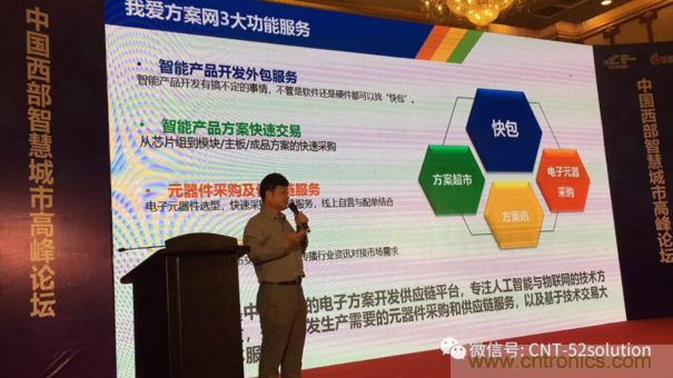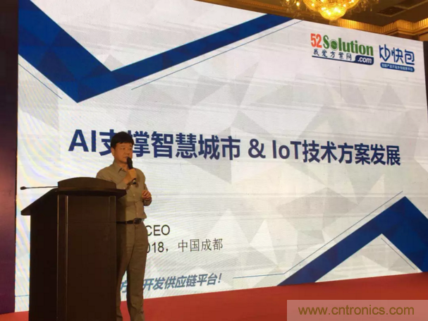 為服務西部產(chǎn)業(yè)創(chuàng)新,中電網(wǎng)絡技術/我愛方案網(wǎng)攜手四川本地技術服務商與中國電子信息博覽會來到成都,我愛方案網(wǎng)的CEO劉杰博士在2018中國智慧城市高峰論壇做大會報告,圍繞“AI支撐智慧城市和IoT技術方案發(fā)展”做了主題講演,分別介紹了AI發(fā)展路徑;通過大數(shù)據(jù)分析AI應用市場需求市場;解讀了AI處理器推動邊緣計算;列舉了大量AI物聯(lián)網(wǎng)方案開發(fā)案例,引起論壇參會人員的深度思考。