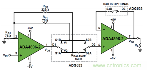 圖 1. 利用 ADA4896-2 和 ADG633 構建低噪聲增益可選放大器來驅動低阻負載