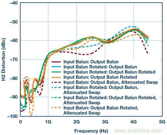 乍一看相當簡單,但魔鬼隱藏在細節(jié)中。圖3顯示了一組HD2測試結果,其系使用本框圖中的所有器件、差分放大器、巴倫、衰減器等得到的。這些測試證明:僅僅用不同方式翻轉巴倫方向所導致的細微相位不匹配,便能在HD2掃頻中產生不同結果。此設置中有兩個巴倫,因此通過顛倒設置一側或兩側的連接可以創(chuàng)建四種可能的場景。結果如圖3所示。