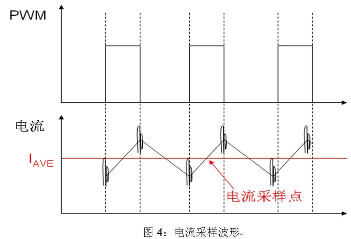 2) 能夠在PWM的開通期間特定時刻觸發(fā)A/D采樣;因為在PWM逆變器帶感性負(fù)載的控制系統(tǒng)中,由于系統(tǒng)的一些寄生參數(shù)導(dǎo)致PWM在開通和關(guān)斷期間電機(jī)的相線上出現(xiàn)振鈴(如圖4所示),這些振鈴會耦合到A/D采樣的回路中,因此我們應(yīng)避開在PWM開關(guān)過程中進(jìn)行A/D采樣。如果我們在PWM開通期間的中點觸發(fā)電流采樣,我們將會得到電流的平均值,這將有利于我們對電流補(bǔ)償?shù)目刂啤?