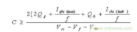 自舉電容必須能夠提供這些電荷,并且保持其電壓。否則Vbs將會有很大的電壓紋波,并且可能會低于欠壓值Vbsuv,使高端無輸出并停止工作。因此Cbs電容的電荷應是最小值的二倍,最小電容值可以由下式計算: