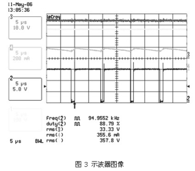 圖 2 、圖3 及表 2、表3 顯示了這種電路在90 ~265 VAC的通用輸入電壓范圍內,以350 mA驅動兩個有6個串聯(lián)LUXEON FLOOD 25-0032 HB-LED板時的結果。表 2 顯示了在輸入電壓范圍內良好的電流調節(jié)。圖 2 和圖3 說明了正如理論所示的,由于占空比較小,輸入電壓較高時紋波較差。這表明在主電壓較低的地區(qū),如北美和日本,設備性能更加良好。然而,即使在最差的條件下,只要控制器輸入電壓保持在90 ~265 VAC的范圍內,仍可對電流進行適時調節(jié)。同時對只使用6個HB-LED板的系統(tǒng)進行了測量(見表 3) ,對比結果發(fā)現(xiàn),±1.3%的調節(jié)差距導致負載電壓的差距高達33.4V ~16.4V。